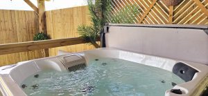 The inviting bedroom features a double bed, a dressing table, and its own Smart TV — perfect for relaxing after a day of exploring or unwinding in the hot tub.