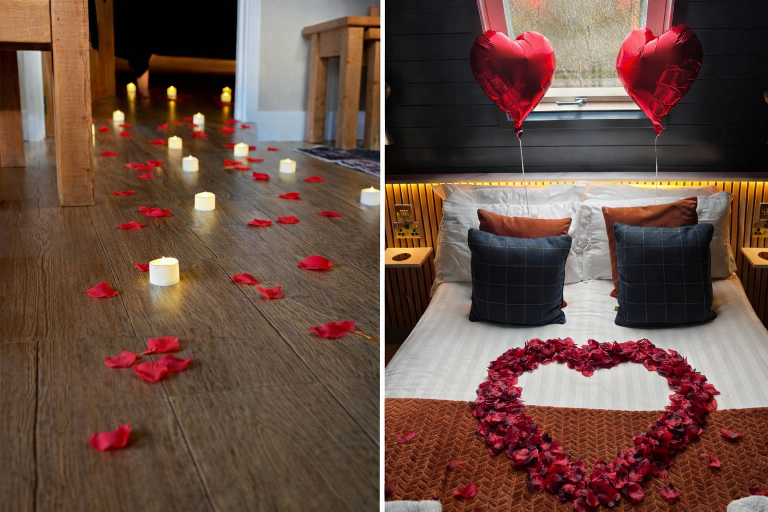 Arrive to your lodge styled with romantic petals, soft candles (battery) and heart-shaped balloons — the perfect surprise for a cosy, romantic stay.