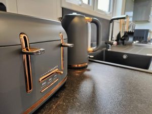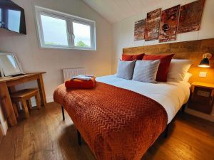 Modern kitchen with oven, gas hob, integrated fridge/small freezer compartment, dishwasher as well as a toaster, kettle & microwave, a comfy sofa, dining table, smart tv and air conditioning. Double bed from which you can relax whilst watching the smart TV, wardrobe and dressing table. There is a separate shower room with wash basin and WC.