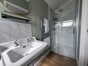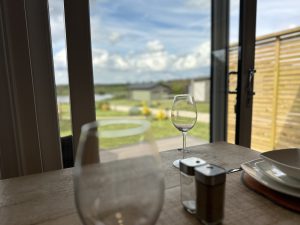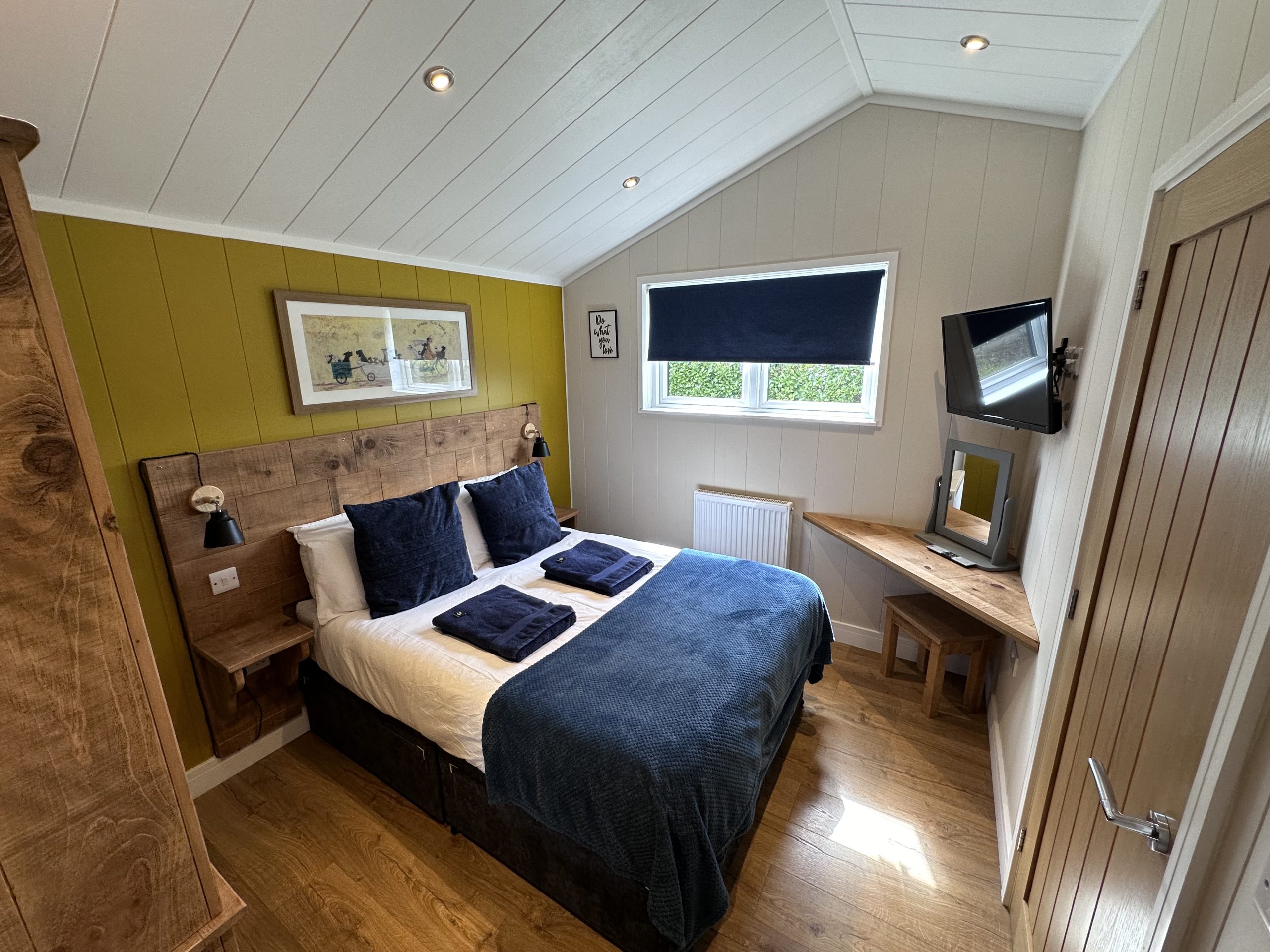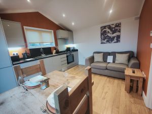 Modern kitchen with oven, gas hob, integrated fridge/small freezer compartment, dishwasher as well as a toaster, kettle & microwave, a comfy sofa, dining table and smart tv. Double bed from which you can relax whilst watching the smart TV, wardrobe and dressing table.